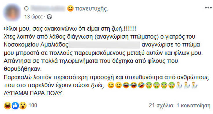 «Φίλοι μου, σας ανακοινώνω ότι είμαι στη ζωή!… Χτες λοιπόν από λάθος διάγνωση (αναγνώριση πτώματος) ο γιατρός του Νοσοκομείου Αμαλιάδος αναγνώρισε το πτώμα μου μπροστά σε πολλούς παρευρισκόμενους μεταξύ αυτών και φίλων μου. Απάντησα σε πολλά τηλεφωνήματα που δέχτηκα από φίλους που θορυβήθηκαν. Παρακαλώ λοιπόν περισσότερη προσοχή και υπευθυνότητα από ανθρώπους που στο παρελθόν έχουν σώσει ζωές..