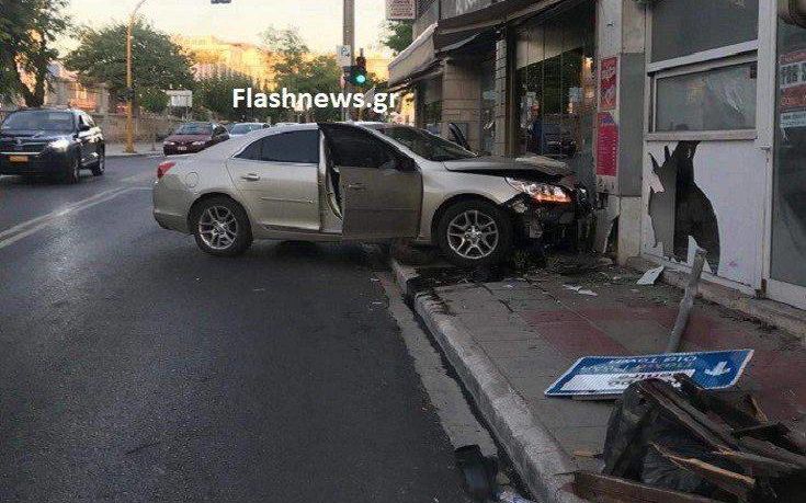 Η σύγκρουση ήταν τόσο σφοδρή που η ταμπέλα που βρισκόταν στο πεζοδρόμιο ξεκόλλησε ενώ προκλήθηκαν υλικές ζημιές σε δύο καταστήματα.