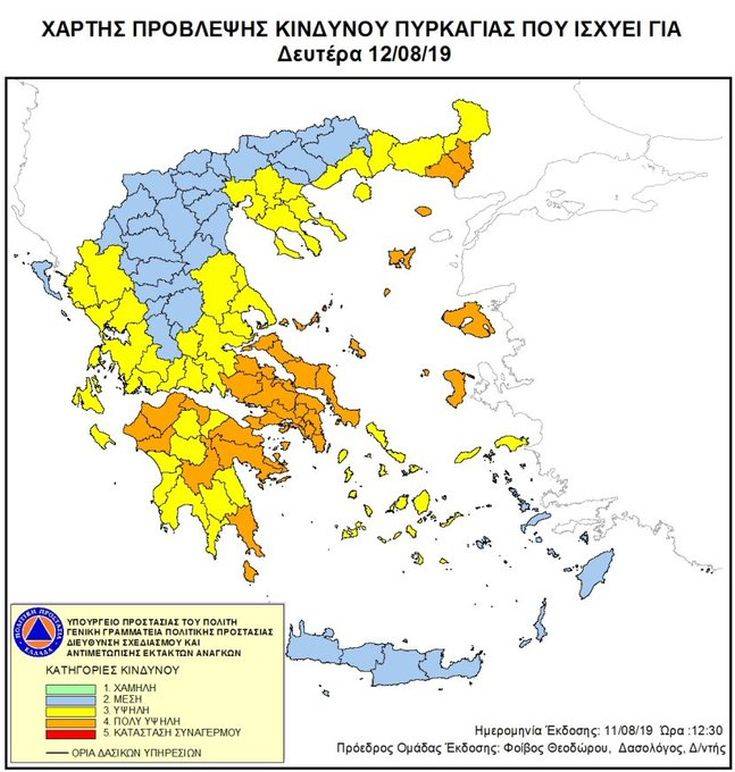 Σύμφωνα με τον Χάρτη Πρόβλεψης Κινδύνου Πυρκαγιάς που εκδίδει η Γενική Γραμματεία Πολιτικής Προστασίας για σήμερα Δευτέρα 12 Αυγούστου 2019 προβλέπεται πολύ υψηλός κίνδυνος πυρκαγιάς (κατηγορία κινδύνου 4) για τις εξής περιοχές: