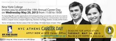 Το New York College σας προσκαλεί στην 19η Ετήσια Ημέρα Καριέρας την Τετάρτη, 29 Μαΐου 2013 και ώρα 11:00 – 19:00, στις κεντρικές εγκαταστάσεις του Κολλεγίου, επί της Λεωφόρου Αμαλίας 38 στο Σύνταγμα.