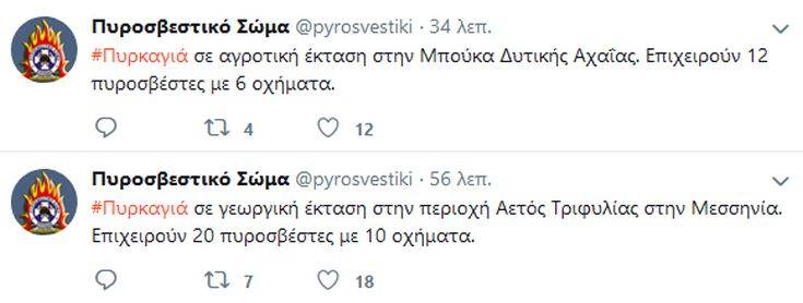 Νωρίτερα φωτιά ξέσπασε σε γεωργική έκταση στην περιοχή Αετός Τριφυλίας στη Μεσσηνία.
