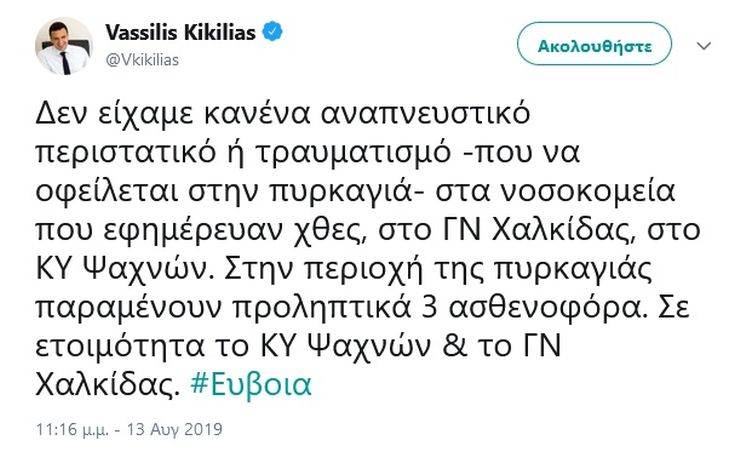 «Δεν είχαμε κανένα αναπνευστικό περιστατικό ή τραυματισμό -που να οφείλεται στην πυρκαγιά- στα νοσοκομεία που εφημέρευαν χθες, στο ΓΝ Χαλκίδας, στο ΚΥ Ψαχνών. Στην περιοχή της πυρκαγιάς παραμένουν προληπτικά 3 ασθενοφόρα. Σε ετοιμότητα το ΚΥ Ψαχνών & το ΓΝ Χαλκίδας» ανέφερε σε tweet του ο υπουργός Υγείας Βασίλης Κικίλιας.