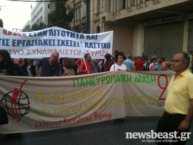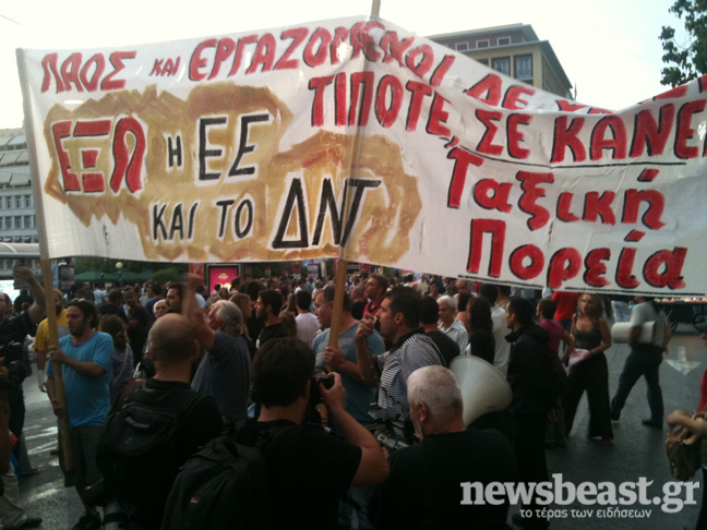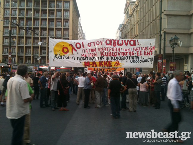 Της πορείας προηγείται μια ομάδα περίπου 50 ατόμων που φωνάζει υβριστικά συνθήματα κατά των συνδικαλιστικών οργανώσεων. Η παρουσία της αστυνομίας είναι διακριτική και προς το παρόν επικρατεί ηρεμία.