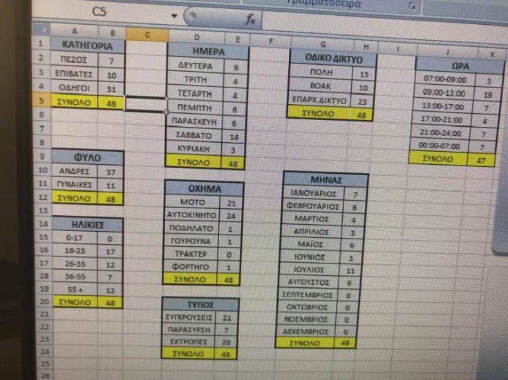- Σε ότι αφορά στις ώρες, οι πλέον επικίνδυνες – με 19 νεκρούς – ήταν μεταξύ 9:00 – 13:00 και ακολουθούν: Από 13:00 – 17:00 με 7 νεκρούς, 21:00 – 24:00 με 7 νεκρούς, 00:00 – 07:00 με 7 νεκρούς 17:00 – 21:00 με 4 και 07:00 – 09:00 με 3 νεκρούς