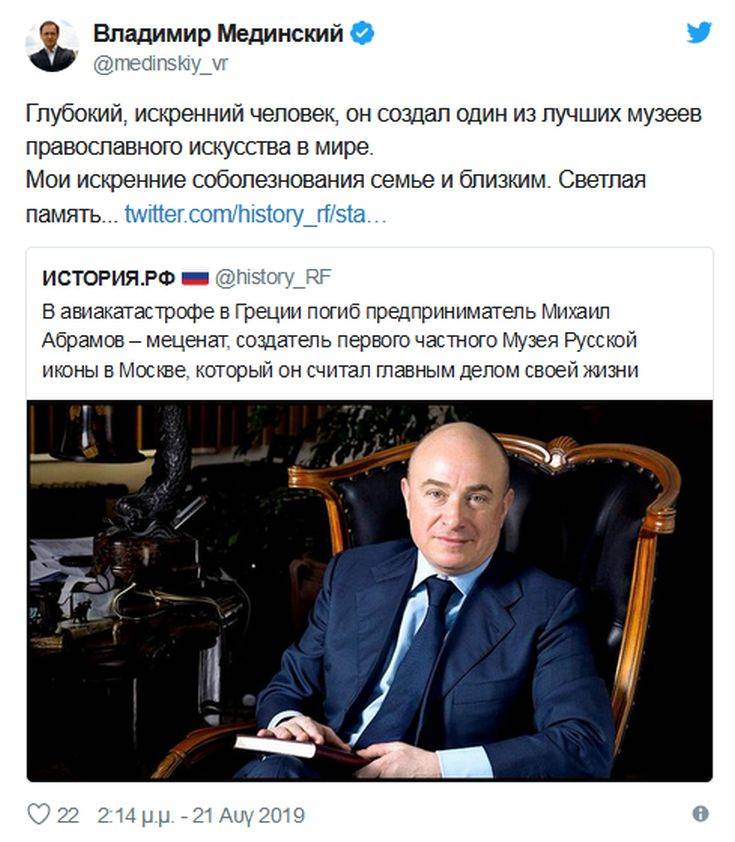 Βαθύτατα συγκλονισμένος ο Ρώσους υπουργός Πολιτισμού Βλαντίμιρ Μεντίνσκι με τον χαμό του Μιχαήλ Αμπράμοφ, τον έναν από τους 3 νεκρούς της μοιραίας πτώσης του ελικοπτέρου στη θάλασσα μεταξύ Γαλατά και Πόρου