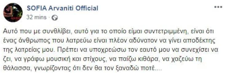«Πρέπει να υποχρεώσω τον εαυτό μου να συνεχίσει να ζει, να γράφω μουσική και στίχους, να παίζω κιθάρα, να χαζεύω τη θάλασσα, γνωρίζοντας ότι δεν θα τον ξαναδώ ποτέ», έγραψε χαρακτηριστικά η Σοφία Αρβανίτη.