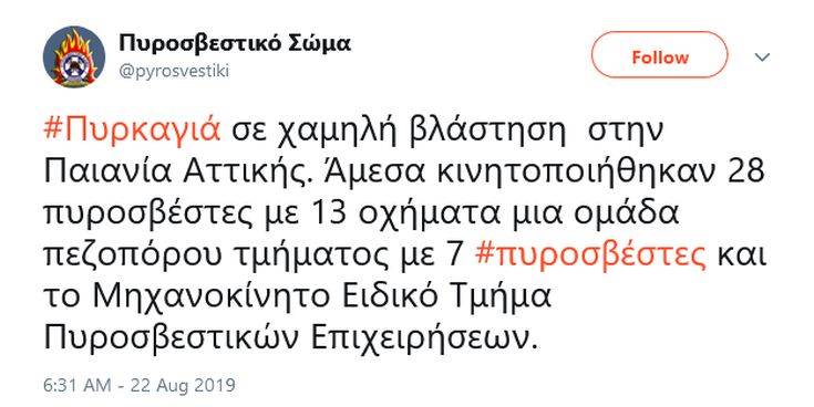 Συναγερμός έχει σημάνει στην Πυροσβεστική για πυρκαγιά που ξέσπασε σε χαμηλή βλάστηση στην Παιανία Αττικής.