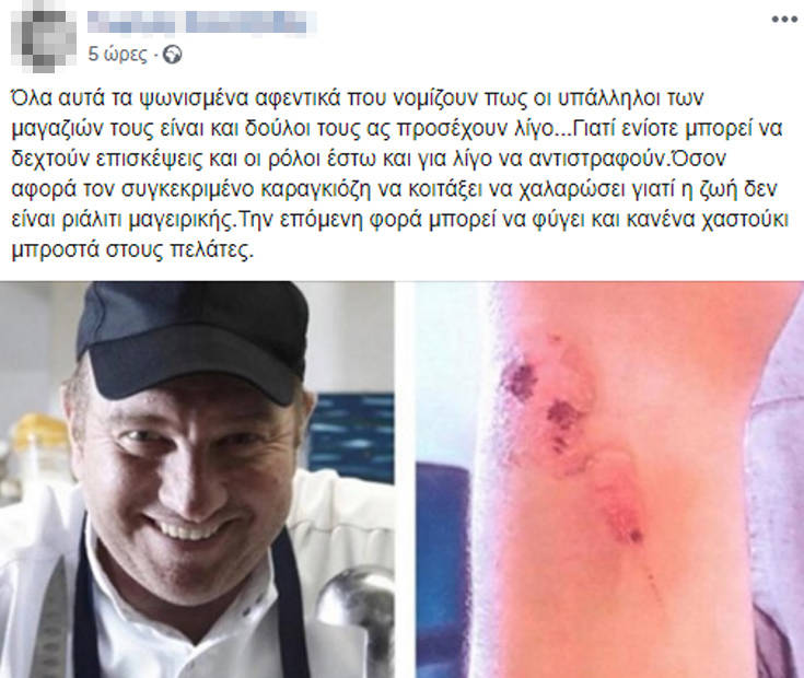 Ανάρτηση στη σελίδα του στο Facebook έκανε και ηγετικό στέλεχος του Ρουβίκωνα στην οποία αναφέρει για τον γνωστό σεφ: «Όλα αυτά τα ψωνισμένα αφεντικά που νομίζουν πως οι υπάλληλοι των μαγαζιών τους είναι και δούλοι τους ας προσέχουν λίγο…Γιατί ενίοτε μπορεί να δεχτούν επισκέψεις και οι ρόλοι έστω και για λίγο να αντιστραφούν. Όσον αφορά τον συγκεκριμένο καραγκιόζη να κοιτάξει να χαλαρώσει γιατί η ζωή δεν είναι ριάλιτι μαγειρικής. Την επόμενη φορά μπορεί να φύγει και κανένα χαστούκι μπροστά στους πελάτες».