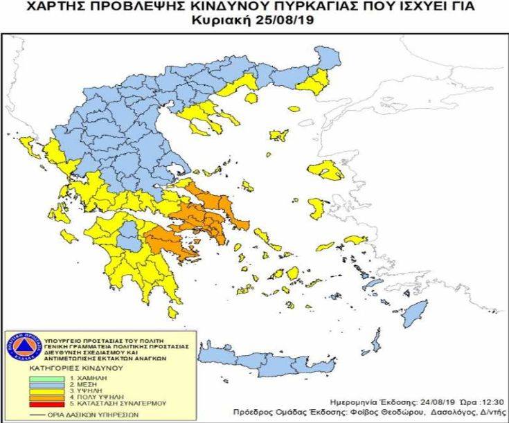 Σύμφωνα με το Χάρτη Πρόβλεψης Κινδύνου Πυρκαγιάς που εκδίδει η Γενική Γραμματεία Πολιτικής Προστασίας του Υπουργείου Προστασίας του Πολίτη για σήμερα Κυριακή 25 Αυγούστου 2019, προβλέπεται πολύ υψηλός κίνδυνος πυρκαγιάς (κατηγορία κινδύνου 4) για τις εξής περιοχές:
