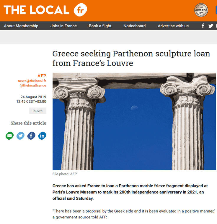 «Έχει υπάρξει πρόταση από την ελληνική πλευρά και έχει αξιολογηθεί θετικά», δήλωσε σε γαλλικά Μέσα αξιωματούχος της κυβέρνησης. «Οι λεπτομέρειες θα εκπονηθούν από τα αντίστοιχα υπουργεία Πολιτισμού. Πρόκειται για μια προσωρινή ανταλλαγή», πρόσθεσε.