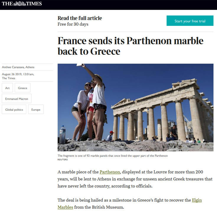 Σε συμφωνία για μία αρχαιολογική ανταλλαγή έχει προχωρήσει, σύμφωνα με τα γαλλικά Μέσα, η Ελλάδα με τη Γαλλία. Μάλιστα, αντίστοιχο ρεπορτάζ παρουσιάζουν και οι Times της Μεγάλης Βρετανίας.