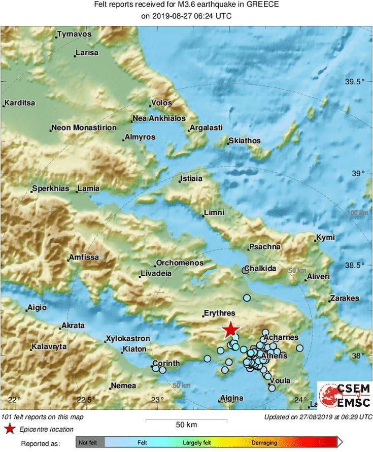 Σεισμική δόνηση έγινε αισθητή πριν από λίγο στην Αθήνα. Σύμφωνα με το Ευρωμεσογειακό Ινστιτούτο, ήταν μεγέθους 3,6 Ρίχτερ.