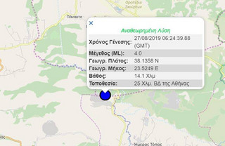 Το Γεωδυναμικό Ινστιτούτο υπολογίζει τη δόνηση στα 4 Ρίτχερ με επίκεντρο 25 χιλιόμετρα βορειοδυτικά της Αθήνας. Εστιακό βάθος υπολογίζεται στα 14,1 χιλιόμετρα.