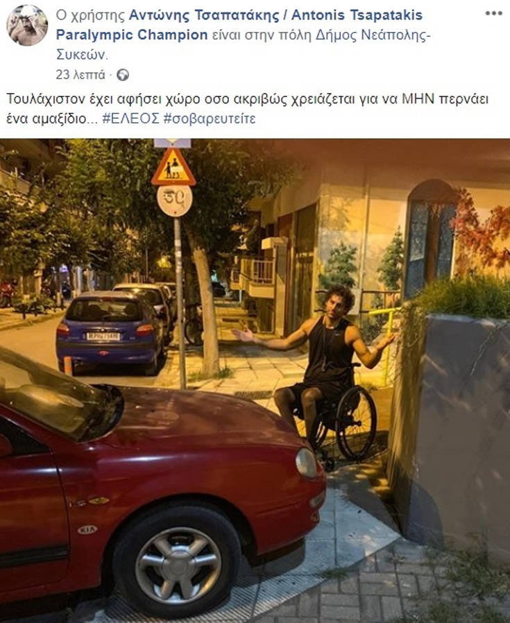 «Τουλάχιστον έχει αφήσει χώρο όσο ακριβώς χρειάζεται για να ΜΗΝ περνάει ένα αμαξίδιο… #ΕΛΕΟΣ #σοβαρευτείτε», γράφει ο Αντώνης Τσαπατάκης ως λεζάντα στη φωτογραφία που κοινοποίησε.