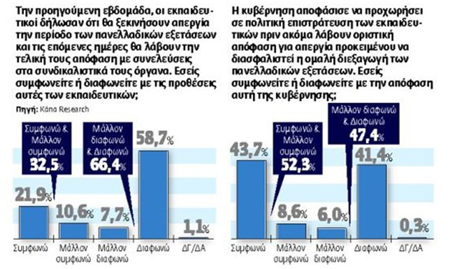 Τα συμπεράσματά της δείχνουν ότι ένα μεγάλο ποσοστό των ερωτηθέντων (66,4%) «μάλλον διαφωνεί ή διαφωνεί» με την απόφαση των καθηγητών να ξεκινήσουν την απεργία τους μέσα στις εξετάσεις.