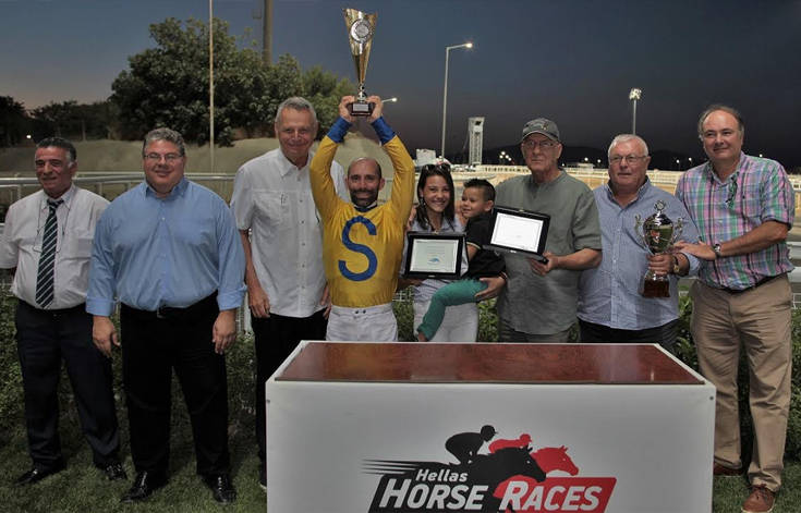 Από αριστερά ο παλαίμαχος αναβάτης και προπονητής Βασίλης Κεράτσας, ο Γενικός Επιχειρησιακός Διευθυντής της ΙΠΠΟΔΡΟΜΙΕΣ Α.Ε. Κώστας Αλεξόπουλος, ο αντιπρόεδρος του ΔΣ της Φιλίππου Ένωσης Ελλάδος Γεώργιος Παρθένης, ο αναβάτης Γιάννης Λαζαρίδης, η κόρη και ο γιός της προπονήτριας Ειρήνης Κεράτσα, οι ιδιοκτήτες του ΑΤΡΕΪΓΙΟΥ Κοσμάς Σκρεπετός και Γιάννης Ντατσόπουλος και ο Διευθυντής Οικονομικών της ΙΠΠΟΔΡΟΜΙΕΣ Α.Ε. Γιώργος Σκούρας