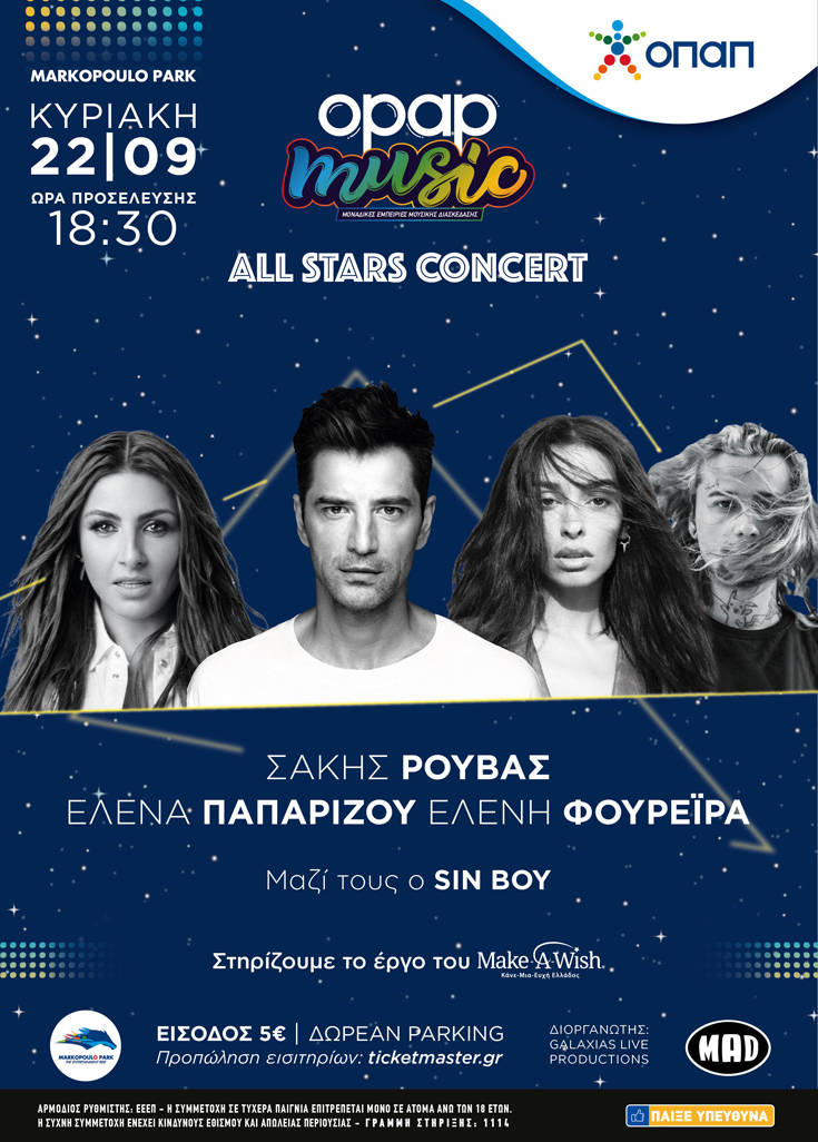O ΟΠΑΠ, έχοντας την ψυχαγωγία των πελατών του στο επίκεντρο των δραστηριοτήτων του, παρουσιάζει τη μεγαλύτερη συναυλιακή έκπληξη της χρονιάς, στον ιππόδρομο Αθηνών, Markopoulo Park, την Κυριακή 22 Σεπτεμβρίου 2019.