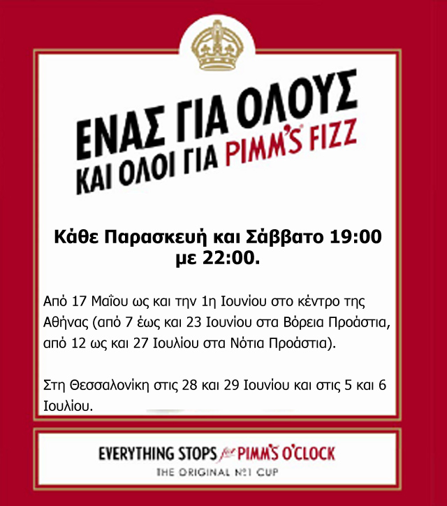 Αν λοιπόν το προσεχές διάστημα περπατάς σε Κέντρο, Βόρεια και Νότια Προάστια και μπροστά σου δεις το χαρακτηριστικό, διώροφο λεωφορείο του Pimm’s τότε… πολύ απλά ξέρεις πως όλα σταματούν γιατί είναι Pimm’s O’Clock!