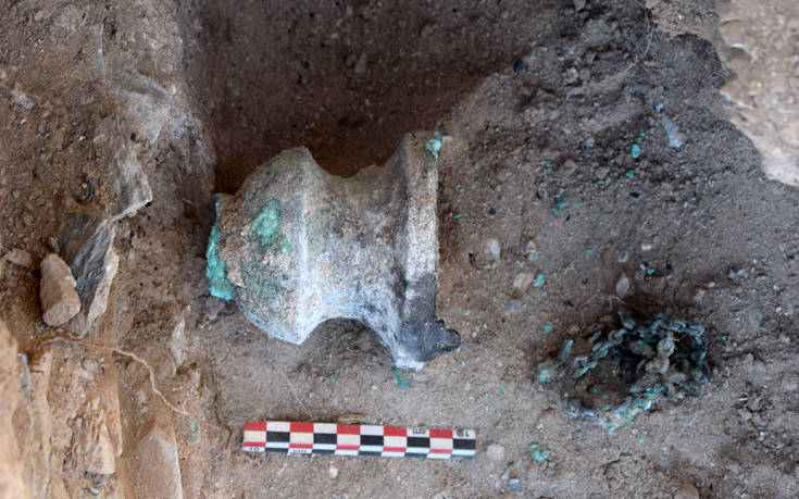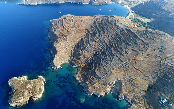 Ως προς το αρχαίο ιερό: «Στο νότιο ανώτερο πλάτωμα της νησίδας αποκαλύφθηκε μνημειώδες ανάλημμα, μήκους σχεδόν 22 μέτρων, που προσωρινά μπορεί να χρονολογηθεί στους κλασικούς χρόνους, τόσο από την ισόδομη τοιχοποιία του, όσο και από την κεραμεική που συλλέχθηκε εντός του στρώματος ‘λατύπης’ που συνδέεται με την κατασκευή του. Τα ευρήματα είναι εξαιρετικής ποιότητας κεραμεική των Γεωμετρικών και αρχαϊκών χρόνων, καθώς και ορισμένα ευρήματα αναμφίβολα αναθηματικού χαρακτήρα (μικρογραφικά αγγεία, πήλινα γυναικεία ειδώλια, κ.ά.). Σε απόσταση 5 μέτρων ανατολικά του αναλήμματος, ο λαξευμένος βράχος σχηματίζει ορθογώνιο έξαρμα διαστάσεων 11×4 μ. περίπου, εξαιρετικά διαβρωμένο σήμερα, το οποίο φαίνεται ότι ταυτίζεται με μνημειώδη βωμό. Το ανάλημμα σχηματίζει ένα είδος κρηπίδας ύψους 4,50 μ., δυτικά του οποίου ο φυσικός βράχος σχηματίζει ένα ευρύχωρο άνδηρο με πολυάριθμα ίχνη από αρχαία λαξεύματα, ορισμένα από τα οποία φαίνεται ότι σχετίζονται με κάποιο μνημειώδη ναό που προφανώς είχε ιδρυθεί εδώ. Η προσεκτική μελέτη των λαξευμάτων αυτών ίσως επιτρέψει να αποσαφηνιστεί ως έναν βαθμό η μορφή του κλασικού-ελληνιστικού ναού. Η ταυτότητα της λατρευόμενης θεότητας παραμένει άγνωστη προς το παρόν».