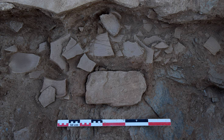 Ως προς το επίμηκες Κτήριο 2 και την οχύρωση: «Η παράκτια οχύρωση της ύστερης αρχαιότητας προστάτευε το αδύναμο ανατολικό τμήμα της βραχονησίδας. Οι υπόλοιπες πλευρές ήταν απροσπέλαστες λόγω της κατακόρυφης διαμόρφωσης των βράχων. Στο εσωτερική πλευρά της είχαν κτιστεί πολυάριθμα επάλληλα ορθογώνια δωμάτια, σε ένα από τα οποία εντοπίστηκε χάλκινος φόλλις του αυτοκράτορα Μαυρικίου Τιβερίου (582-602). Η έρευνα λίγο βορειότερα έφερε στο φως την κύρια είσοδο της οχύρωσης, πιθανόν προστατευμένη με πύργο. Η οχύρωση της ύστερης αρχαιότητας εδράζεται πάνω σε παλαιότερη, πιθανώς των αρχαϊκών χρόνων, φάση με την οποία φαίνεται να συνδέονται χώροι εν μέρει λαξευμένοι στο φυσικό βράχο. Από τις αναμοχλευμένες επιχώσεις των πρωτοβυζαντινών χρόνων προέρχονται και λίγα ευρήματα (κεραμεική και εργαλεία από οψιανό) της Πρωτοκυκλαδικής περιόδου, καθώς και σημαντικές ποσότητες κεραμεικής των Γεωμετρικών έως ρωμαϊκών χρόνων», επισημαίνει το ΥΠΠΟΑ.
