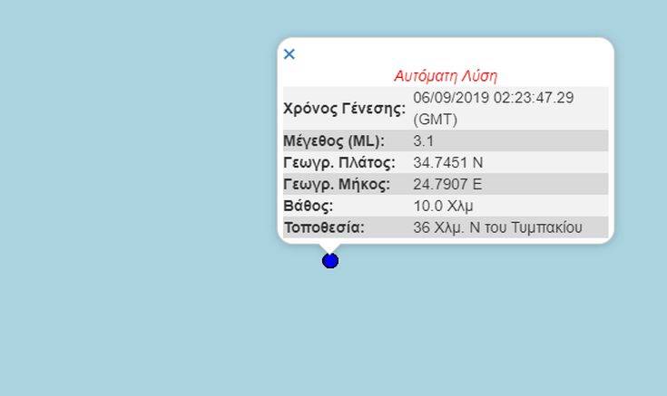 Το επίκεντρο του σεισμού εντοπίστηκε στα 36 χιλιόμετρα νότια του Τυμπακίου, ενώ το εστιακό βάθος υπολογίζεται στα 10 χιλιόμετρα.