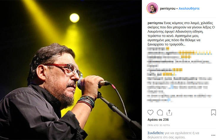 «Ένας κόμπος στο λαιμό, χιλιάδες σκέψεις που δεν μπορούν να γίνουν λέξεις Ο Λαυρέντης έφυγε! Αδιανόητη είδηση, τεράστιο το κενό. Αγαπημένε μου, αγαπημένε μας πόσο θα θέλαμε να ξαναρχίσει το τραγούδι…», έγραψε χαρακτηριστικά.