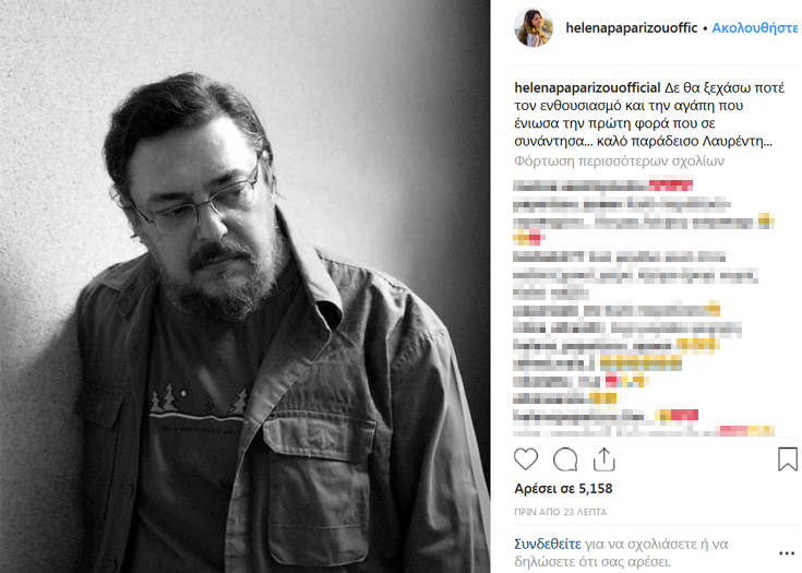 «Δε θα ξεχάσω ποτέ τον ενθουσιασμό και την αγάπη που ένιωσα την πρώτη φορά που σε συνάντησα… καλό παράδεισο Λαυρέντη…», έγραψε χαρακτηριστικά, ενώ το «αντίο» το συνόδευσε με μία ασπρόμαυρη φωτογραφία του Μαχαιρίτσα.