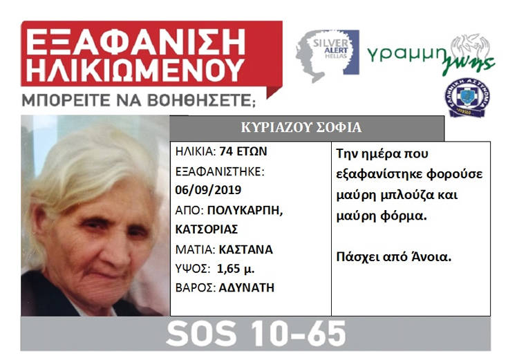 Κανένα σημείο ζωής δεν έχει δώσει από τις 6 Σεπτεμβρίου η 74χρονη Σοφία Κυριαζού, που εξαφανίστηκε από την Πολυκάρπη Καστοριάς.