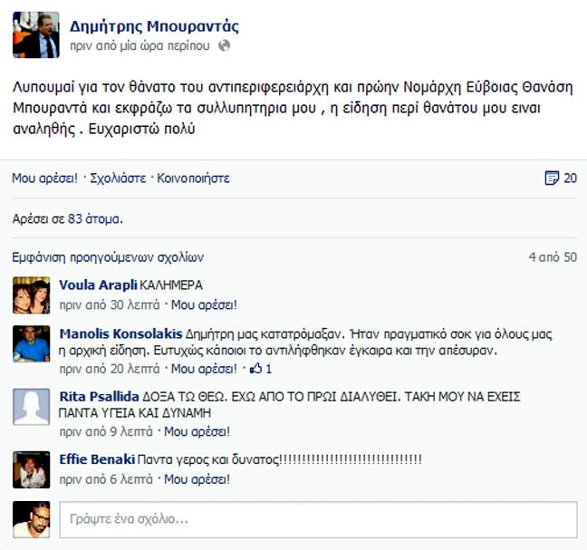 «Λυπουμαί για τον θάνατο του αντιπεριφερειάρχη και πρώην Νομάρχη Εύβοιας Θανάση Μπουραντά και εκφράζω τα συλλυπητηρια μου , η είδηση περί θανάτου μου ειναι αναληθής . Ευχαριστώ πολύ» είπε.