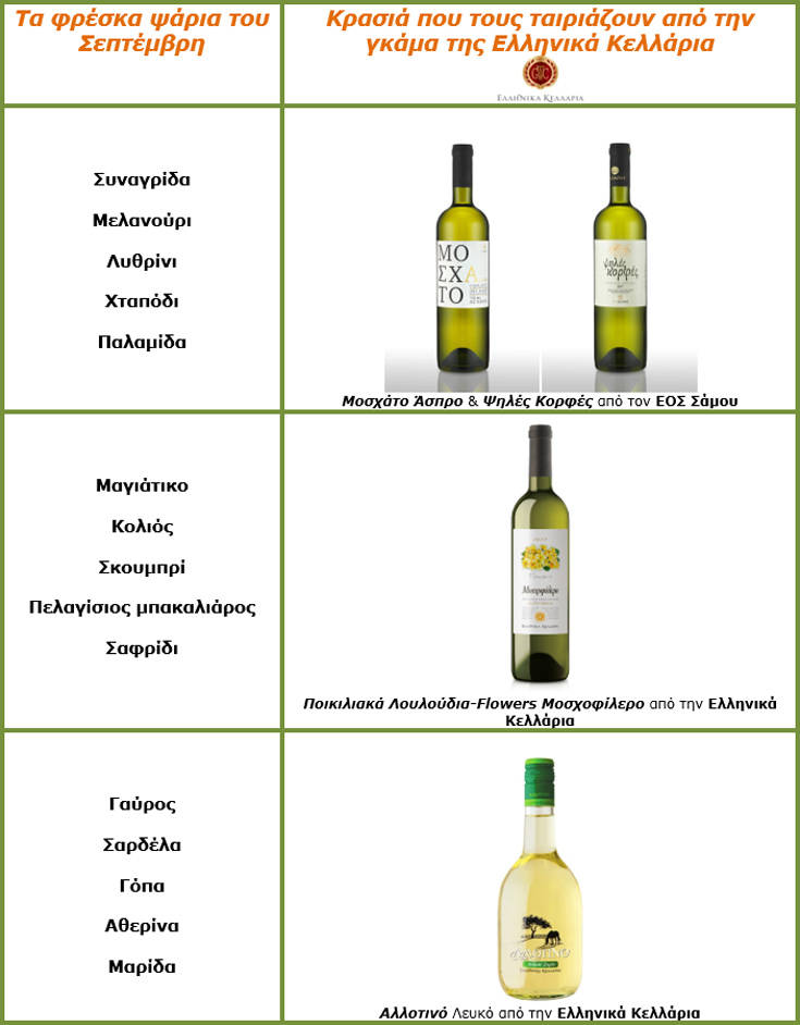 Η ιδανική περίοδος για να απολαύσει κανείς τα υπέροχα ψάρια των ελληνικών θαλασσών είναι στην εποχή τους. Η Ελληνικά Κελλάρια σας προτείνει τα φρέσκα ψάρια του Σεπτέμβρη και πώς θα τα συνδυάσετε ιδανικά με τα μοναδικά, λευκά κρασιά από την πλούσια γκάμα της.
