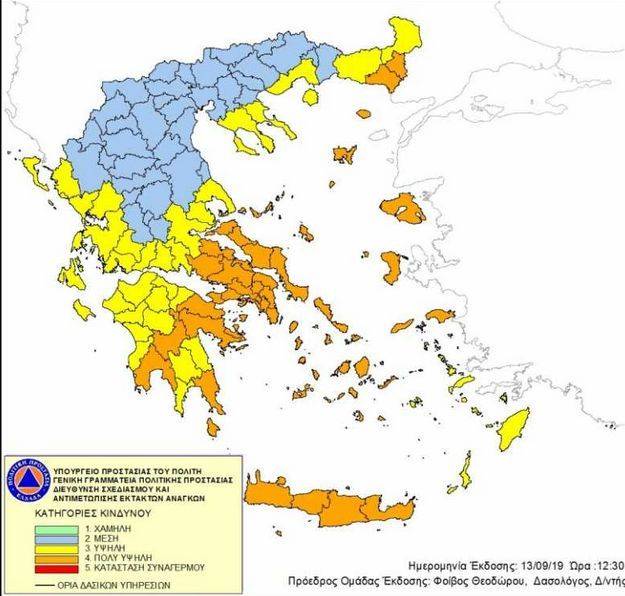 Σύμφωνα με το Χάρτη Πρόβλεψης Κινδύνου Πυρκαγιάς που εκδίδει η Γενική Γραμματεία Πολιτικής Προστασίας του Υπουργείου Προστασίας του Πολίτη (www.civilprotection.gr), για το Σάββατο 14 Σεπτεμβρίου 2019, προβλέπεται πολύ υψηλός κίνδυνος πυρκαγιάς (κατηγορία κινδύνου 4) για τις εξής περιοχές: