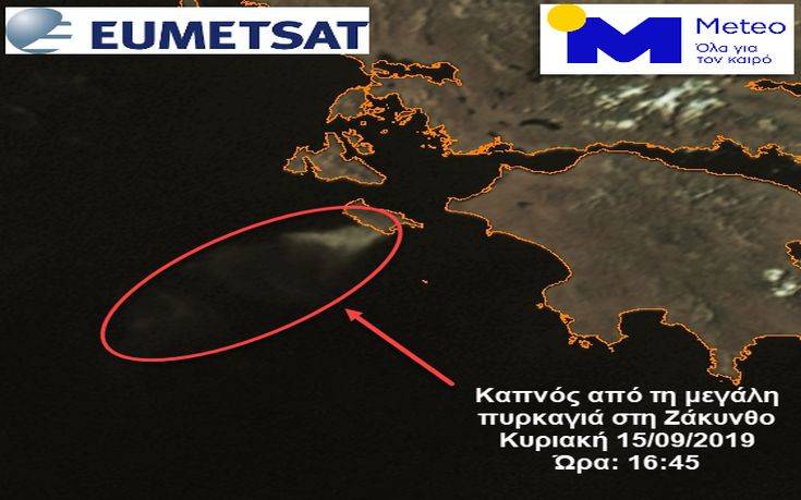 Καθώς συνέχισε να μαίνεται εκτός ελέγχου η φωτιά που ξέσπασε στη Ζάκυνθο το πρωί της Κυριακής, ο καπνός έγινε ορατός στις 16:45 ώρα Ελλάδας από τον μετεωρολογικό δορυφόρο Meteosat-11, ο οποίος βρίσκεται σε ύψος 36.000 χιλιομέτρων πάνω από τη Γη.