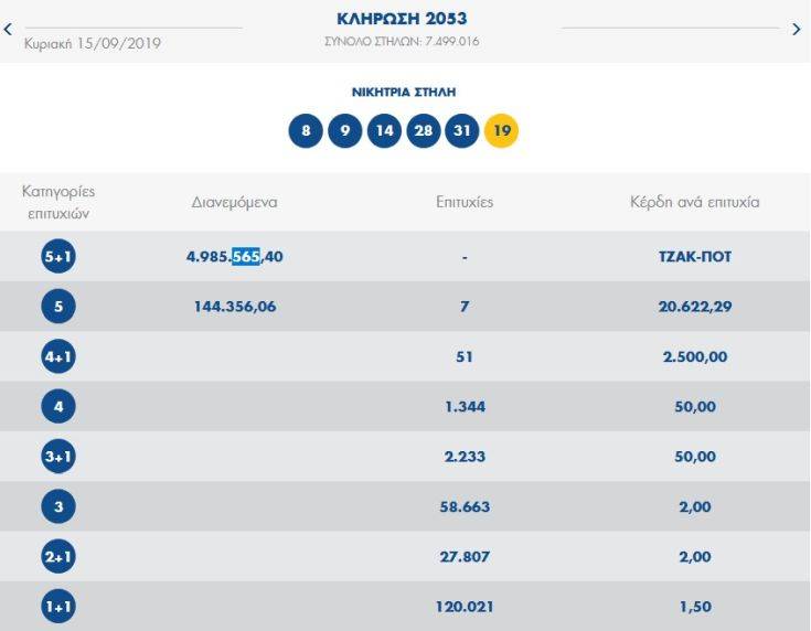 Οι τυχεροί αριθμοί της χθεσινής κλήρωσης είναι οι: 8, 9, 14, 28, 31 και Τζόκερ το 19.
