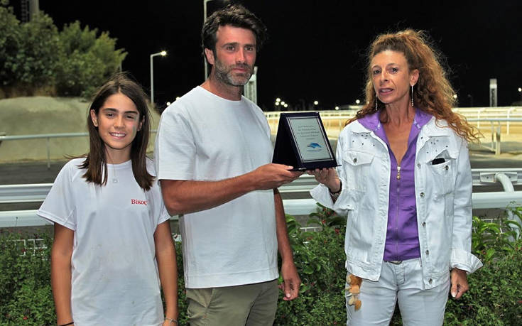 Η ιδιοκτήτρια του ΝΙΟΥ ΤΖΕΝΕΡΕΪΣΟΝ, Paola Cosentini, παραλαμβάνει από τον διοργανωτή του Off-Road Adventure Festival, Βαλάντη Πιτσικάλη, τιμητική πλακέτα για την νίκη του ίππου της