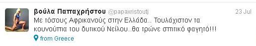 «Με τόσους Αφρικανούς στην Ελλάδα, τα κουνούπια του Δυτικού Νείλου θα τρώνε σπιτικό φαγητό», είχε αναρτήσει στο λογαριασμό που διατηρεί στο Twitter, προκαλώντας σάλο.