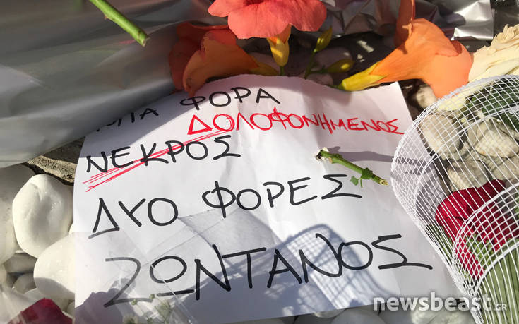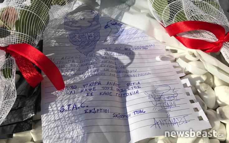 «Μία φορά δολοφονημένος, δυο φορές ζωντανός» γράφει κάποιος με μεγάλα γράμματα διορθώνοντας το νεκρός που ήταν αρχικά γραμμένο σε ένα λευκό χαρτί. «Παύλο ψυχάρα άναψε φωτιά και κάψε τους φασίστες σε κάθε γειτονιά» γράφει ένα άλλο μήνυμα.