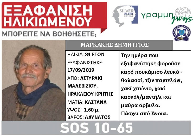 Εδώ και τρεις ημέρες, από τις 17 Σεπτεμβρίου, έχουν χαθεί τα ίχνη του 84χρονου Δημήτρη Μαρκάκη στο Ηράκλειο της Κρήτης.