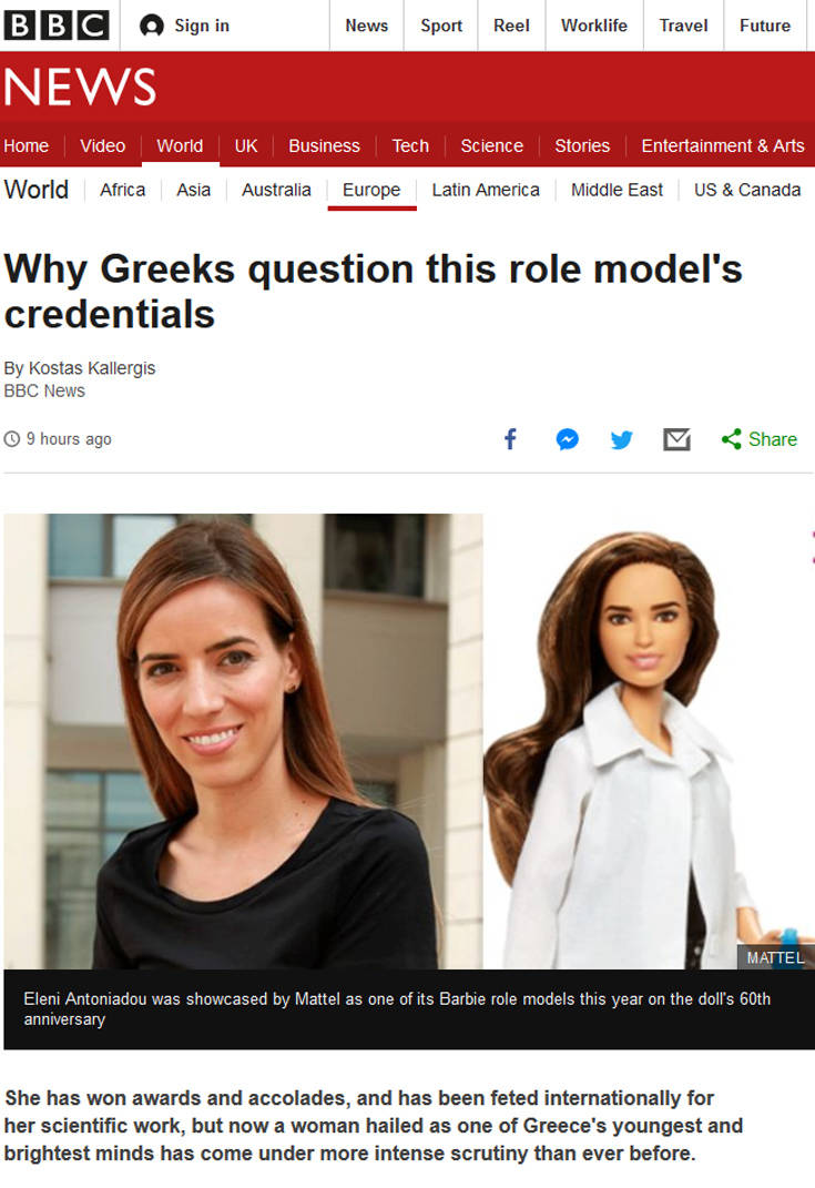 Στο θέμα που έχει προκύψει με την Ελένη Αντωνιάδου αναφέρεται σημερινό δημοσίευμα του BBC, με τίτλο «Γιατί οι Έλληνες αμφισβητούν τα διαπιστευτήριά της».