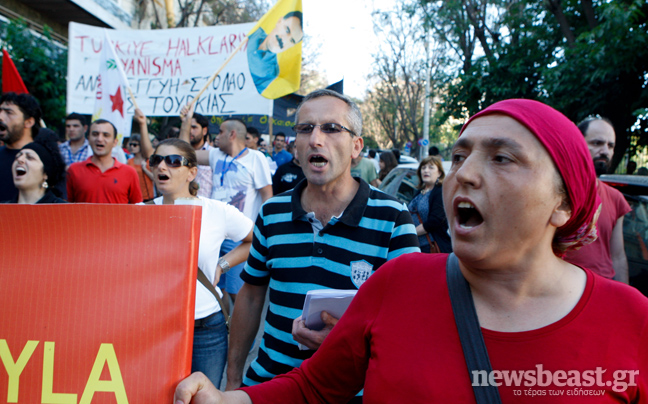Οι συγκεντρωμένοι κρατούσαν πανώ με συνθήματα στα ελληνικά όπως «Αλληλεγγύη στον λαό της Τουρκίας», «Έλληνες και Τούρκοι, εργάτες ενωμένοι» και φώναζαν συνθήματα στην τουρκική γλώσσα, καλώντας τον Τούρκο πρωθυπουργό Ρετζέπ Ταγίπ Ερντογάν να παραιτηθεί. Ζήτησαν επίσης να θυροκολλήσουν ψήφισμα, αλλά οι αστυνομικοί δεν τους το επέτρεψαν.