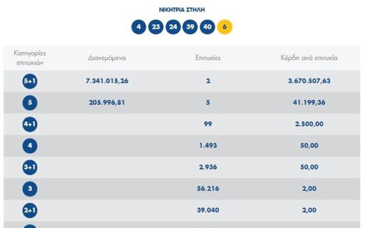 Οι τυχεροί αριθμοί είναι οι: 4, 23, 24, 39, 40 και ΤΖΟΚΕΡ: 6