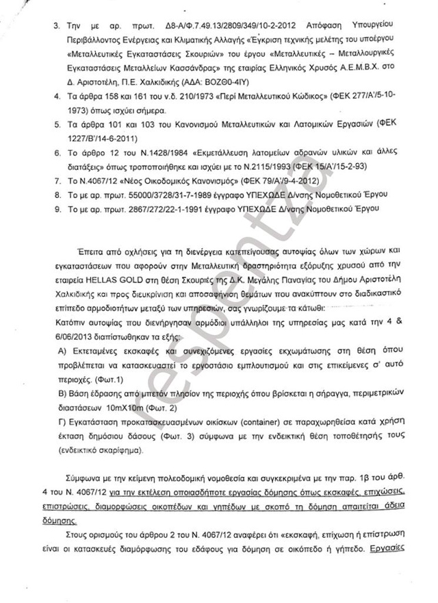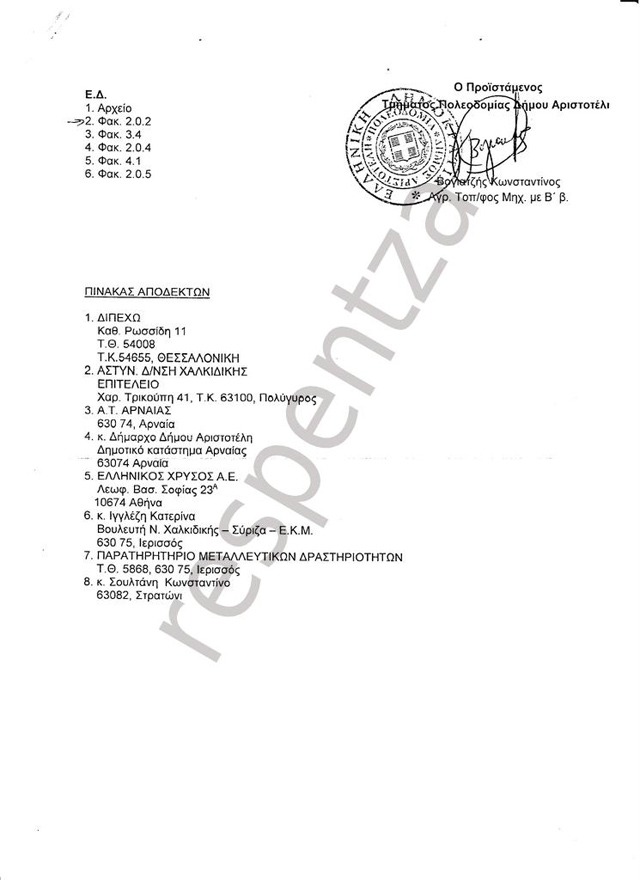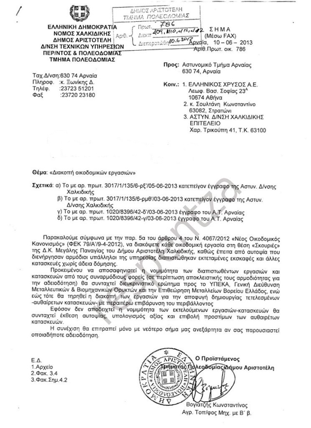 Παρακαλούμε σύμφωνα με την παρ 5α του άρθρου 4 του Ν. 4067/2012 «Νέος Οικοδομικός Κανονισμός» [ΦΕΚ 79Α/2012] να διακόψετε κάθε οικοδομική εργασία στη θέση «Σκουριές» της Μεγάλης Παναγίας του δήμου Αριστοτέλη Χαλκιδικής, καθώς έπειτα από αυτοψία που διενήργησαν αρμόδιοι υπάλληλοι της υπηρεσίας διαπιστώθηκαν εκτεταμένες εκσκαφές και άλλες κατασκευές χωρίς άδεια δόμησης.
