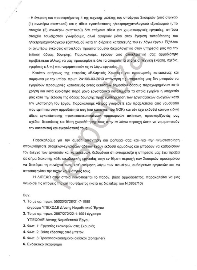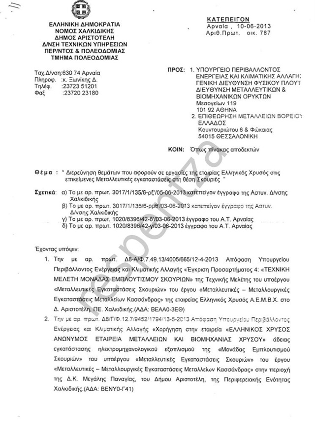 Το τμήμα Πολεοδομίας του δήμου Αριστοτέλη με έγγραφό του προς το Αστυνομικό Τμήμα Αρναίας ζητάει τη διακοπή των οικοδομικών εργασιών στις Σκουριές ενώ με δεύτερο έγγραφό της ζητάει από το υπουργείο Περιβάλλοντος την «Διερεύνηση θεμάτων που αφορούν σε εργασίες της εταιρίας Ελληνικός Χρυσός στις επικείμενες Μεταλλευτικές εγκαταστάσεις στη θέση Σκουριές».
