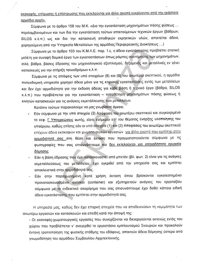 Προκειμένου να αποσαφηνιστεί η νομιμότητα των διαπιστωθέντων εργασιών και κατασκευών από τους συναρμόδιους φορείς (σε περίπτωση αποκλειστικής τους αρμοδιότητας για την αδειοδότηση) θα συνταχθεί διερευνητικό ερώτημα προς το ΥΠΕΚΑ, Γενική Διεύθυνση Μεταλλευτικών και Βιομηχανικών Ορυκτών και την Επιθεώρηση Μεταλλείων Βορείου Ελλάδος, ενώ έως τότε θα τηρηθεί η διακοπή των εργασιών για την αποφυγή δημιουργίας τετελεσμένων – αυθαίρετων κατασκευών με περαιτέρω επιβάρυνση του περιβάλλοντος.