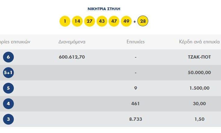 Οι τυχεροί αριθμοί του ΛΟΤΤΟ είναι 1, 14, 27, 43, 47, 49 Bonus: 28