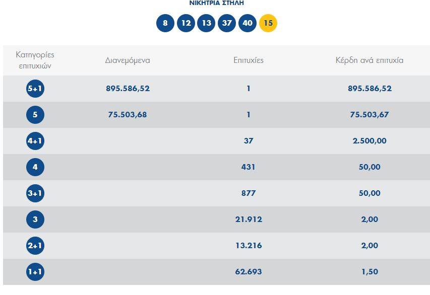 Οι τυχεροί αριθμοί είναι οι: 8, 12, 13, 37, 40