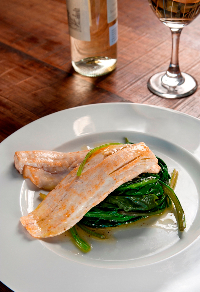 • BRANZINO A BIETOLA: Φιλέτο από φρέσκο λαβράκι με σέσκουλα και σος από ελαιόλαδο, φρέσκο λεμόνι και ψητό σκόρδο