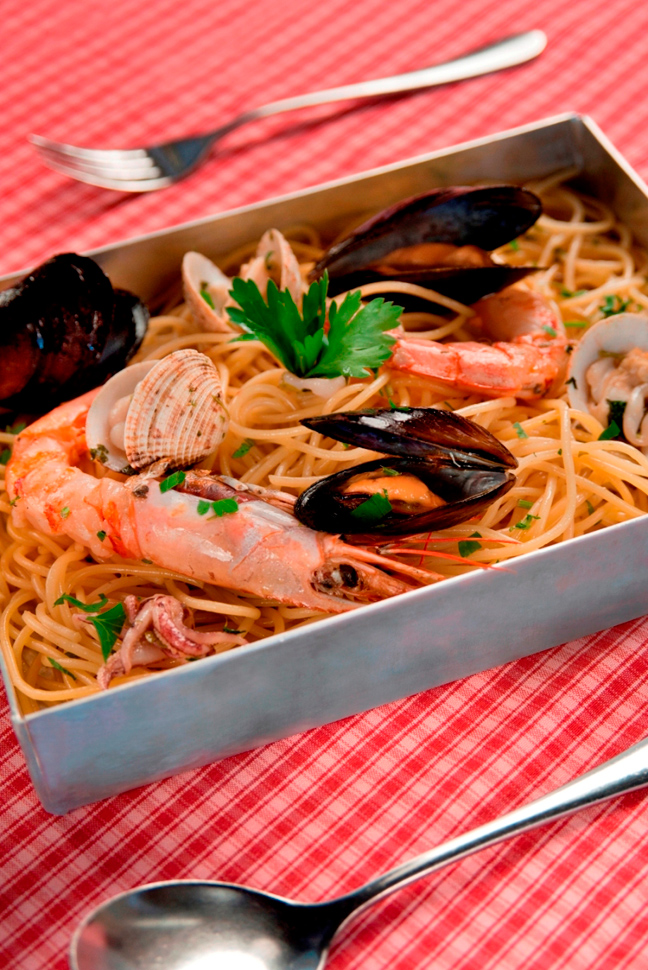 • MARINARA ALLA SICILIANA: Σπαγγέτι με θαλασσινά και διάφανη σάλτσα από κρασί, ζωμό και φρέσκα βότανα