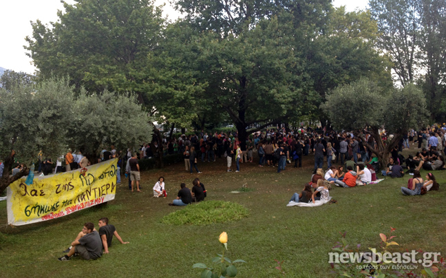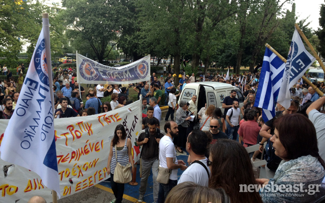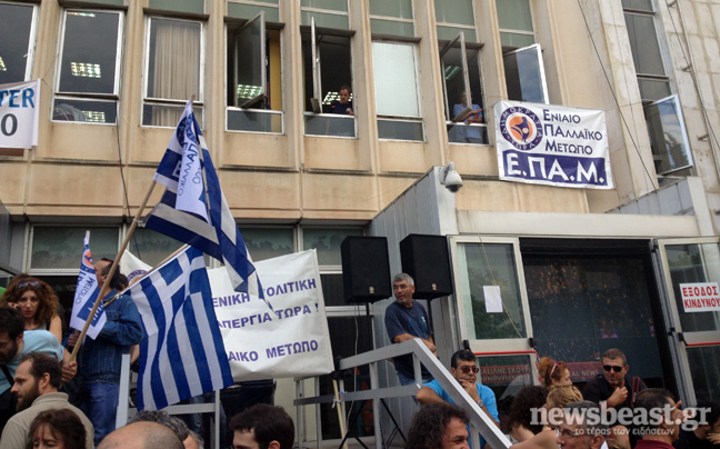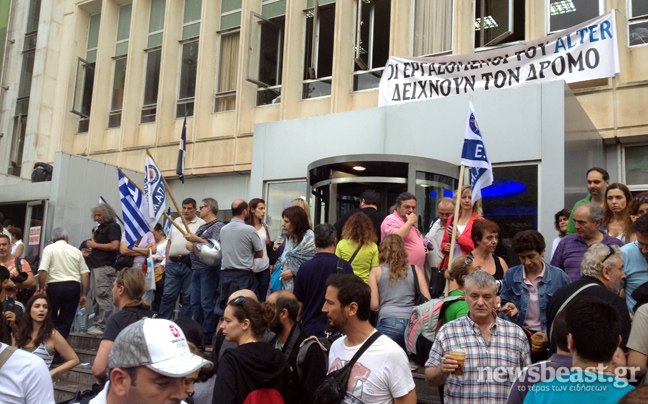 Πλήθος κόσμου παραμένει συγκεντρωμένο έξω από το ραδιομέγαρο της ΕΡΤ για δεύτερη ημέρα μετά την ανακοίνωση του κλεισίματος της δημόσιας τηλεόρασης και την πτώση των πομπών εκπομπής του σήματός της.