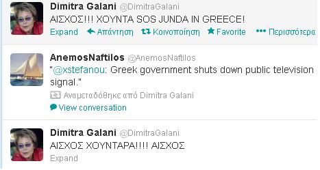 Το «λουκέτο» στην ΕΡΤ σχολίασε στο twitter της και η τραγουδίστρια, Δήμητρα Γαλάνη, η οποία ζητά να σταματήσει την απεργία η ΕΣΗΕΑ προκειμένου να βλέπουν οι πολίτες τι συμβαίνει αυτή τη στιγμή στο Ραδιομέγαρο της ΕΡΤ.