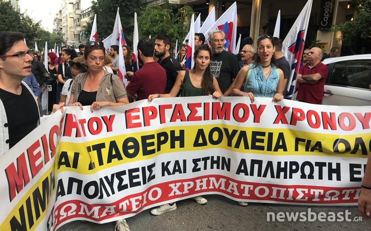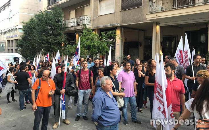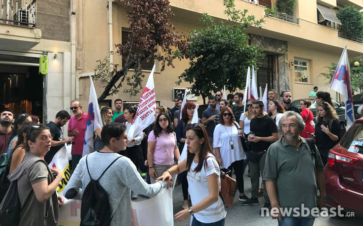 Πολυπληθής διαμαρτυρία μελών του ΠΑΜΕ μπροστά από συμβολαιογραφείο στο κέντρο της Αθήνας.